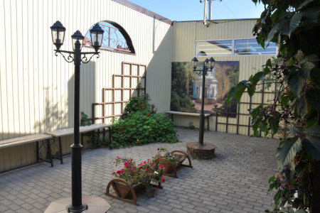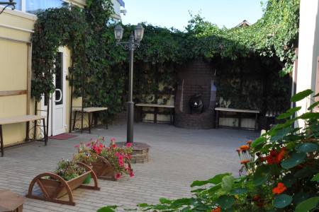 Приятной особенностью нашего банкетного зла является милый внутренний дворик со скамейками, расположенными в тени раскидистого вяза и навесов, увитых виноградом. Уюта и сказочности дворику добавляет изящный небольшой фонтан и приятное теплое освещение, которое обеспечивается несколькими фонарями, стилизованными «под старину».