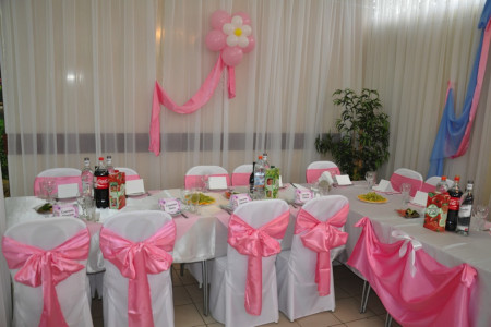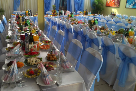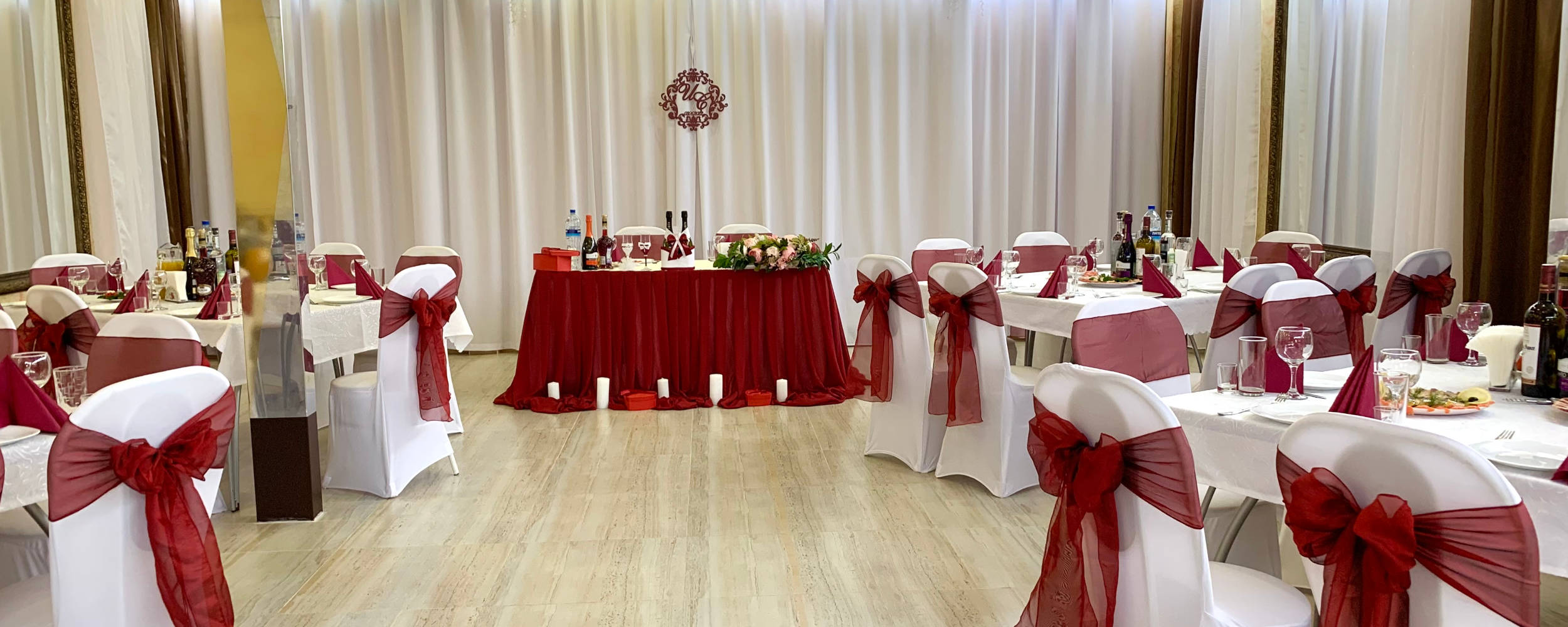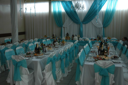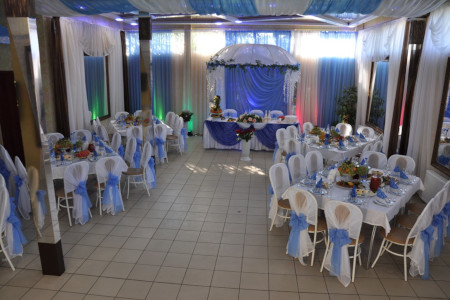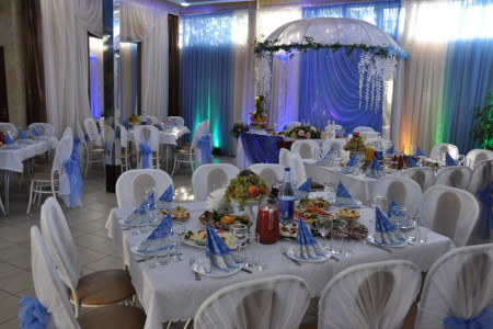 Банкетный зал на Чкалова идеально подходит для проведения самых важных мероприятий, таких как свадьба или юбилей. Элегантный дизайн помещения в пастельных тонах песочного оттенка, дополненный бело-голубой драпировкой, делает интерьер уместным для любого торжественного события.